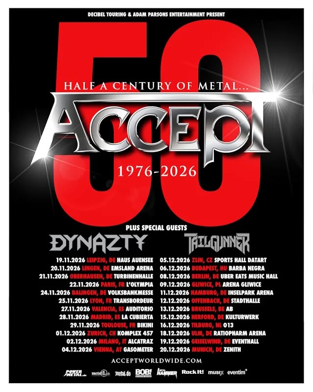 Die deutschen Heavy-Metal-Ikonen ACCEPT feiern Ende 2026 ihr 50-jähriges Bestehen mit einer umfangreichen Europa-Tournee. Die „ACCEPT 50th Anniversary Tour 2026“ markiert einen historischen Meilenstein in der außergewöhnlichen Karriere der Band, die seit fünf Jahrzehnten zu den prägenden Kräften des internationalen Heavy Metal gehört.
