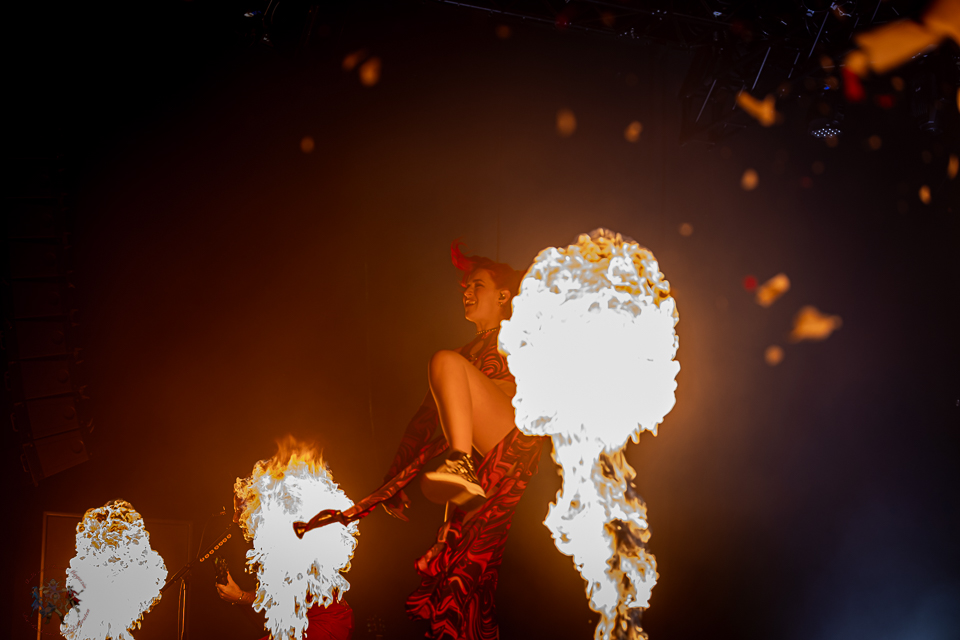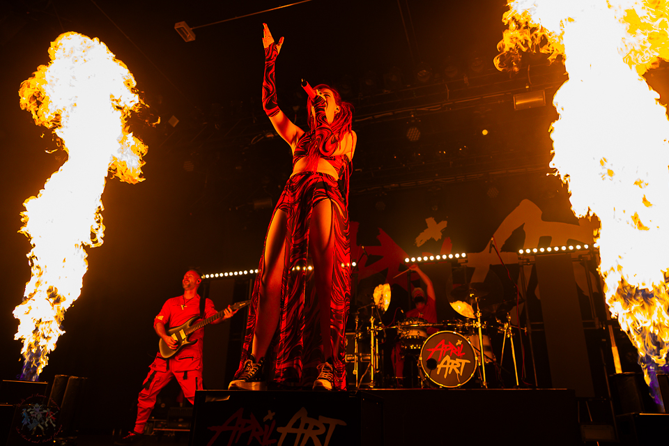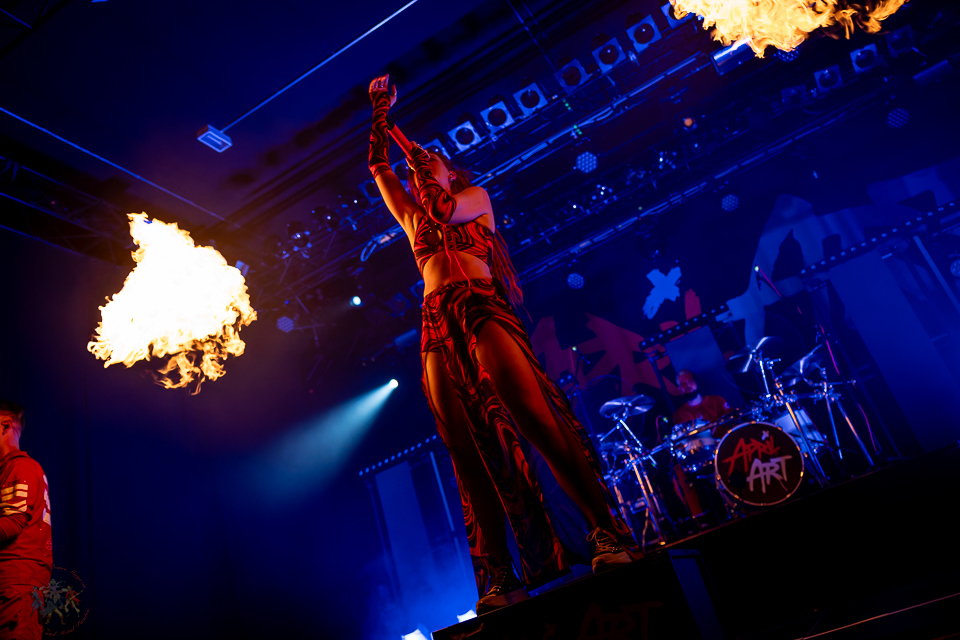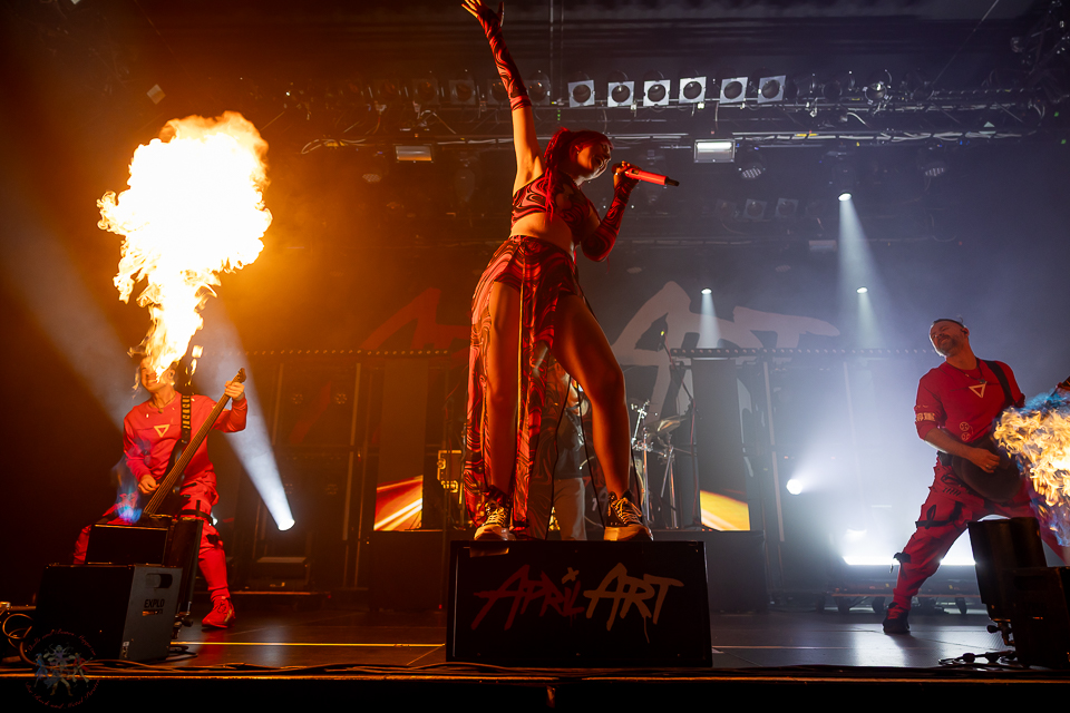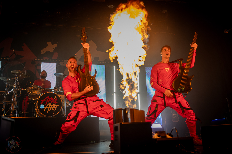 Als April Art die Bühne betreten, schießen beim Opener „Break Out“ sofort die Flammen in die Höhe. Pyrotechnik von der ersten Sekunde an – ein visuelles Statement für dieses Heimspiel. „Rising High“ und „Burn“ folgen nahtlos und treiben die Energie weiter nach oben, während „Break The Silence“ und „Superhero“ die melodische Stärke der Band unterstreichen.