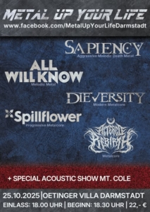 Darmstadt, 25. Oktober 2025 – Das traditionsreiche Event Metal Up Your Life in der Oetinger Villa lädt am Samstag, den 25. Oktober 2025, erneut zum Headbangen, Mitsingen und Feiern ein. Bereits zum neunzehnten Mal verwandelt sich die Villa in einen Schmelztiegel aus Härte, Melodie und Atmosphäre – ein Muss für alle Freunde lauter Gitarren und ehrlicher Livemusik.